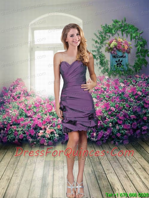 Sweetheart Ruching Hand Made Flowers Column Junior Dresses in Eggplant Purple