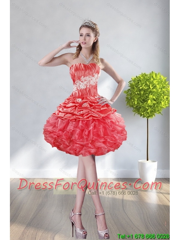 2015 Fashionable Strapless Watermelon Red Prom Dresses With Appliques and Ruffles
