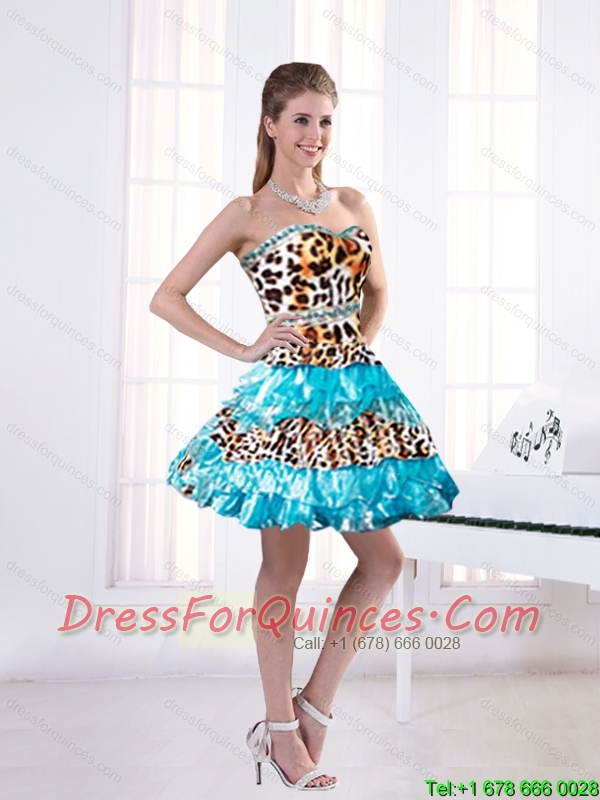 2015 Leopard Printed Sweetheart Mini length Prom Dresses in Aqua Blue with Beading