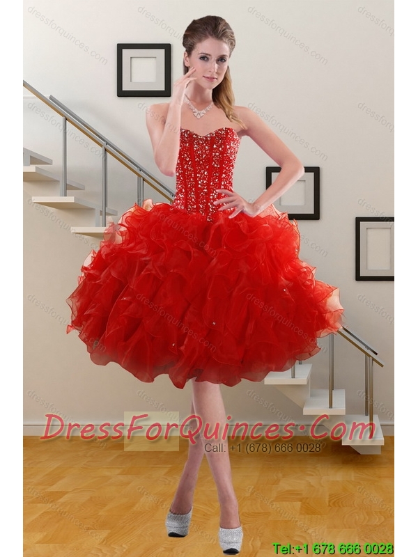2015 Pretty Sweetheart Ruffled Red Prom Dresses with Beading