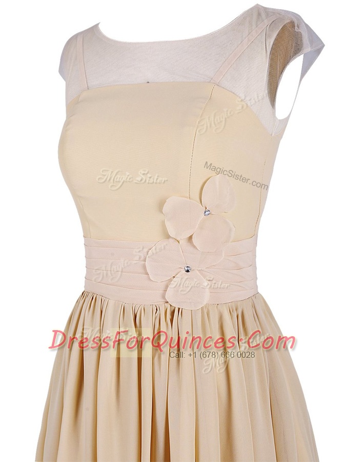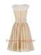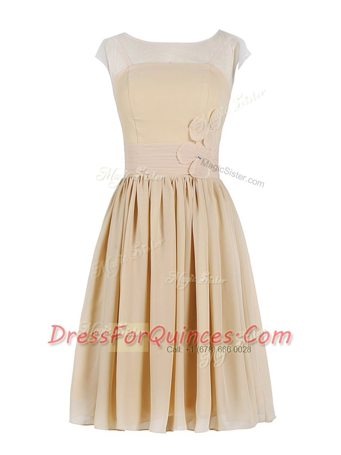 Beautiful Scoop Cap Sleeves Knee Length Appliques and Ruching Zipper Prom Party Dress with Champagne