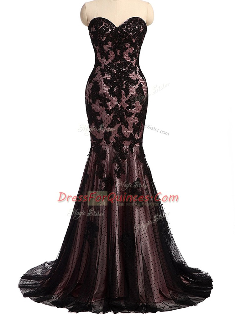 Black Mermaid Sweetheart Sleeveless Tulle and Lace Brush Train Lace Up Lace and Appliques Prom Dresses