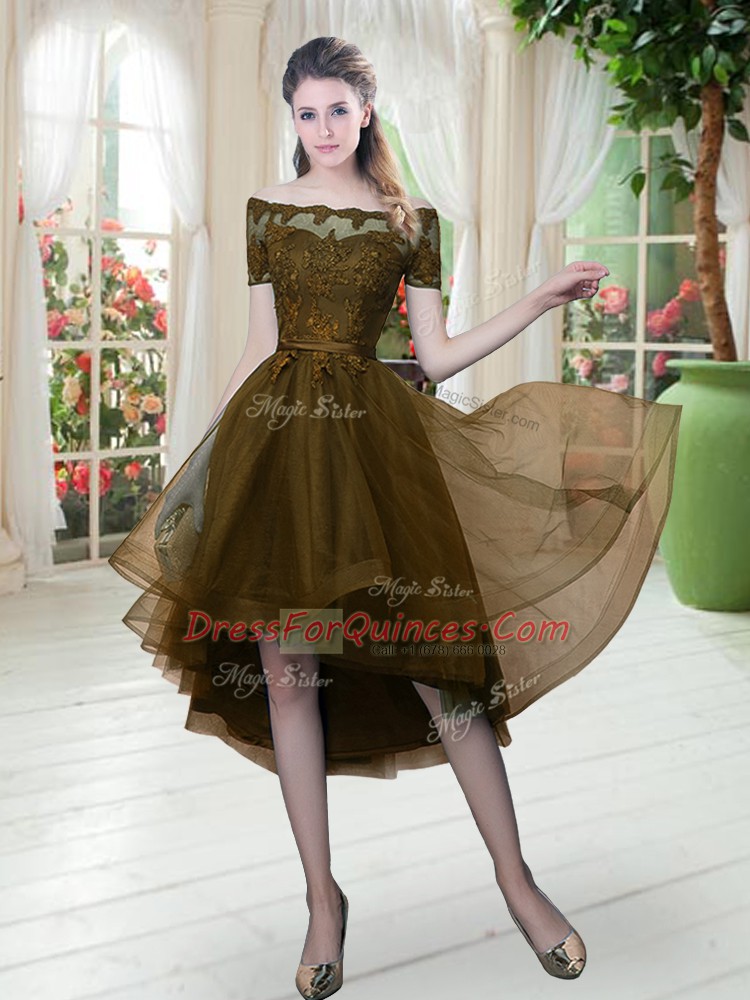 Brown Tulle Lace Up Off The Shoulder Short Sleeves High Low Evening Dress Lace