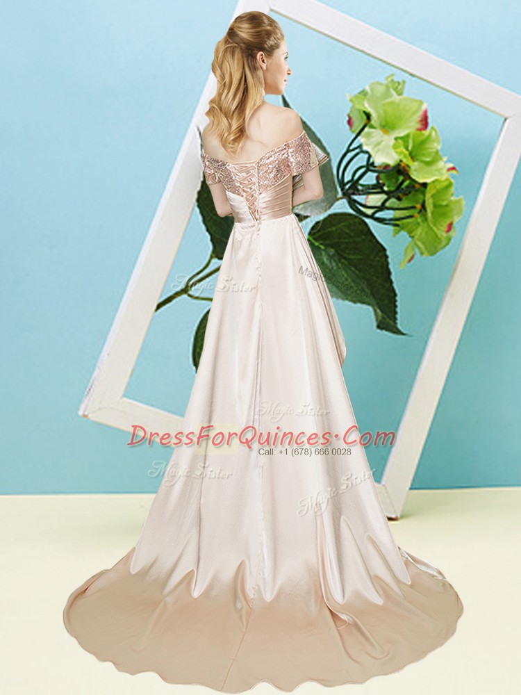 Champagne Off The Shoulder Lace Up Sequins Short Sleeves