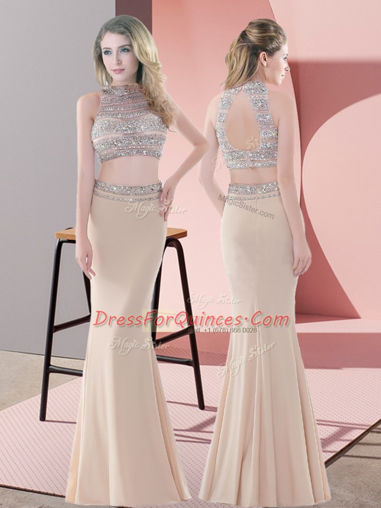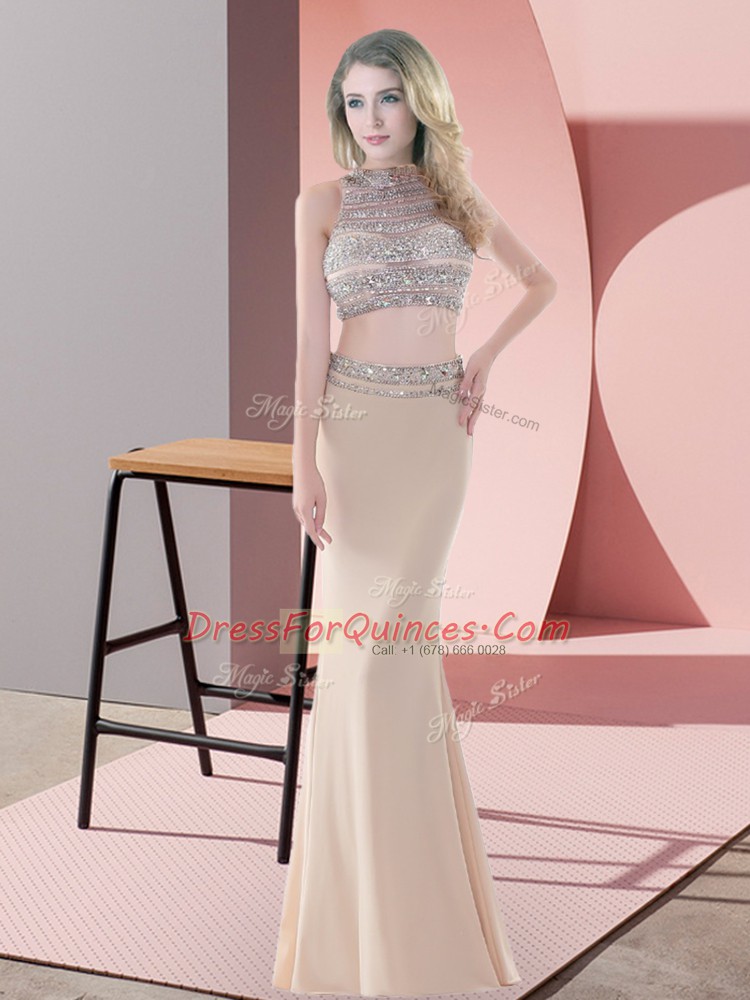 Champagne Two Pieces Beading Homecoming Dress Backless Satin Sleeveless Floor Length