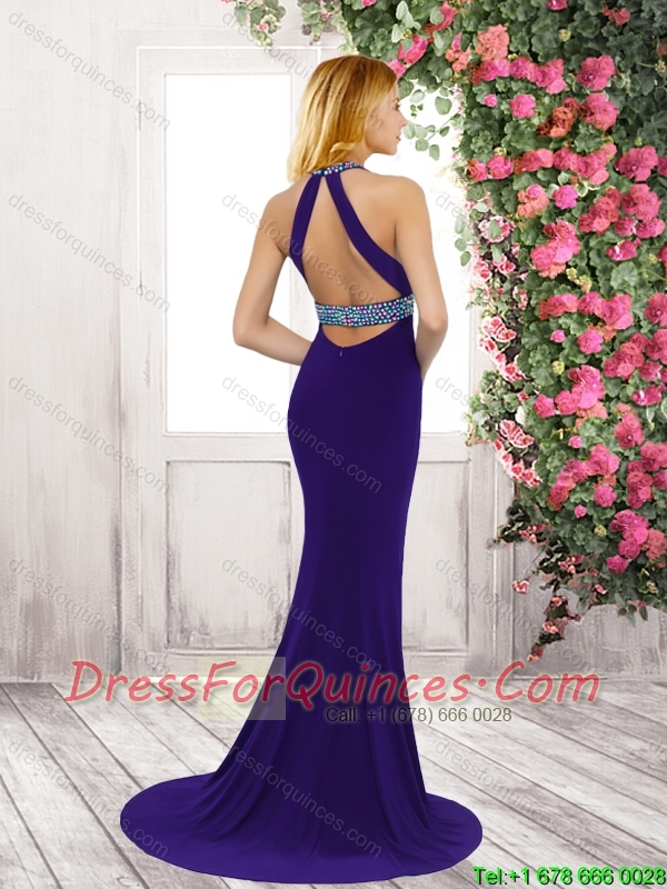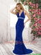 Cheap Mermaid Brush Train Blue Prom Dresses with Beading