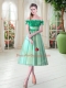 Cheap Turquoise A-line Off The Shoulder Sleeveless Tulle Tea Length Lace Up Appliques Prom Party Dress