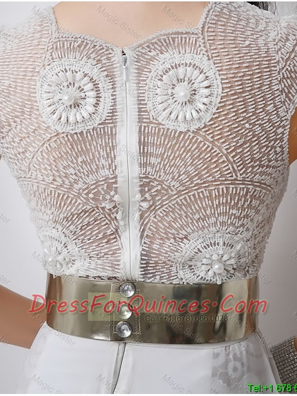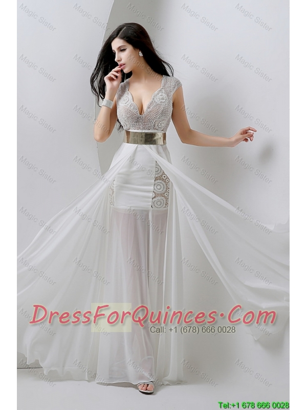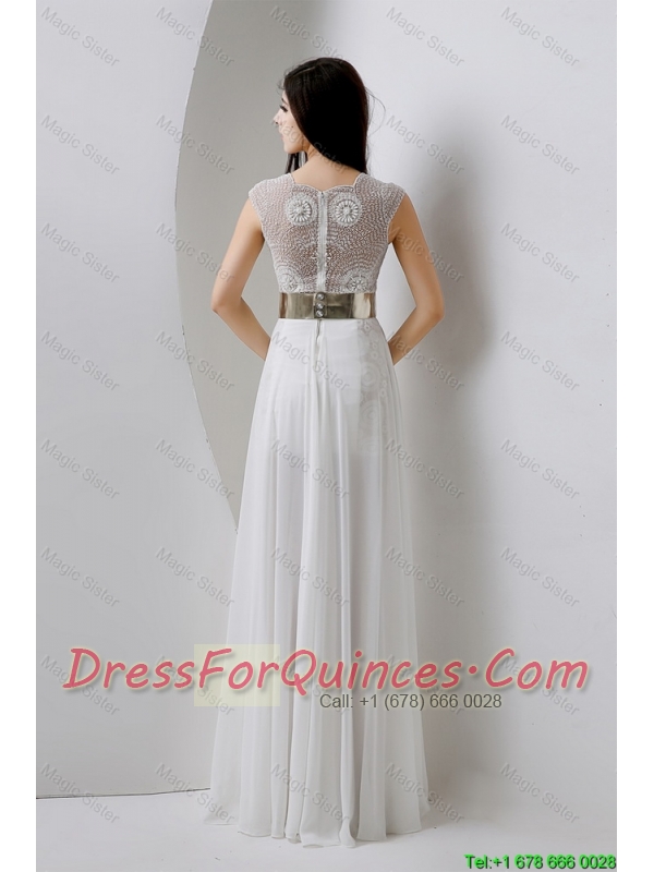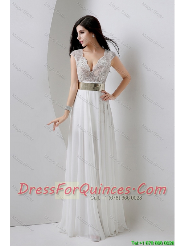 Classical Empire V Neck White Prom Dresses with Beading and Belt