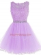 Customized Lavender A-line Scoop Sleeveless Tulle Mini Length Zipper Beading and Lace and Appliques Prom Gown