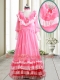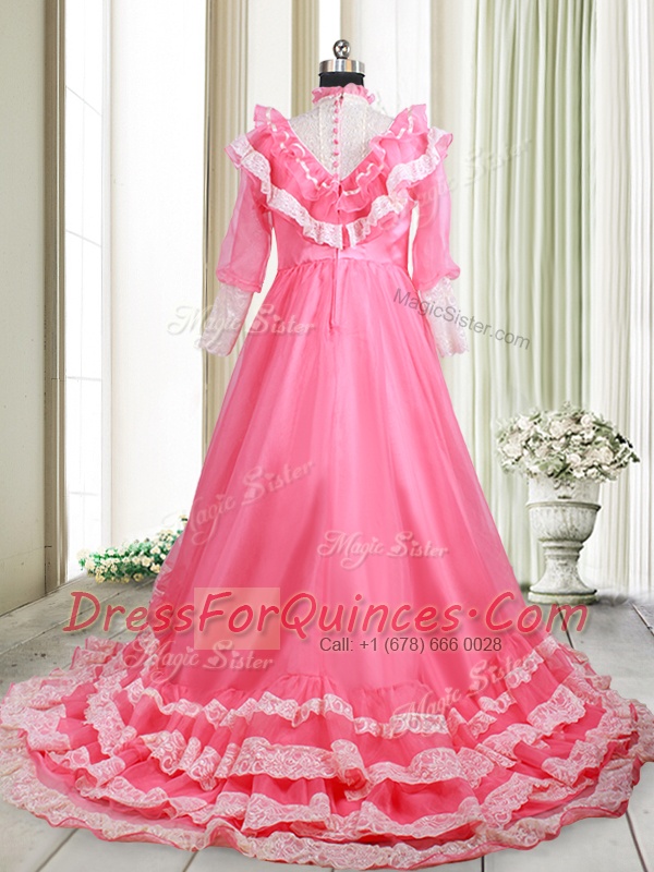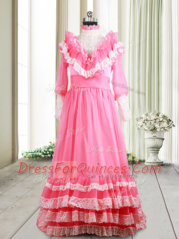 Customized Pink Dress for Prom Prom and For with Beading and Lace and Ruffled Layers V-neck Long Sleeves Brush Train Zipper
