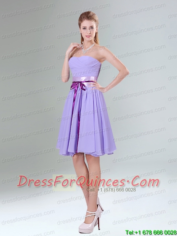 Decent Lavender Ruched Mini Length Prom Dress with Bowknot Sash