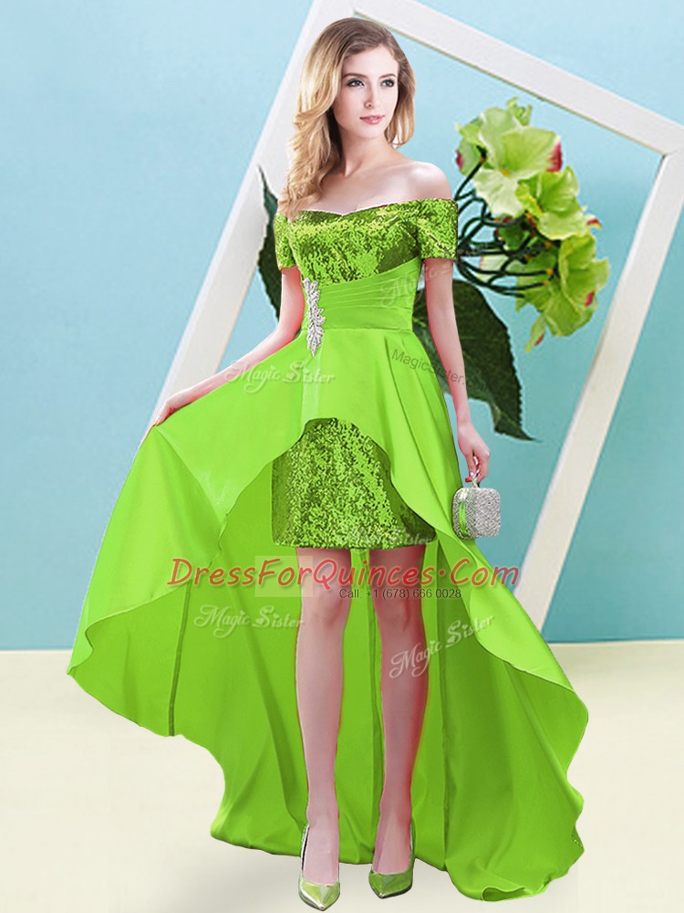 Elastic Woven Satin and Sequined Short Sleeves High Low Evening Dress and Beading