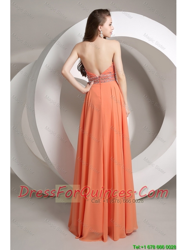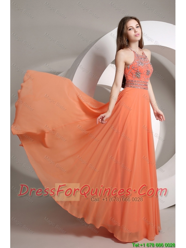 Elegant Beaded Empire Orange Prom Dresses with Halter Top
