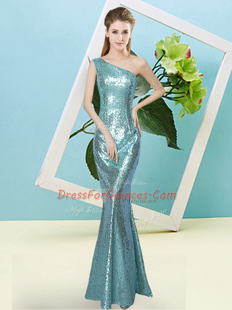 Flare Aqua Blue Sequined Zipper Prom Gown Sleeveless Floor Length Sequins