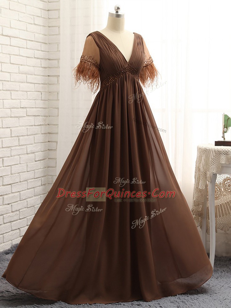 Flare Brown Empire V-neck Sleeveless Chiffon Floor Length Zipper Beading and Ruching Dress for Prom