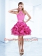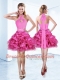 Free and Easy Halter Top Sleeveless Organza Mini Length Zipper Prom Evening Gown in Hot Pink with Ruffles and Ruching and Belt