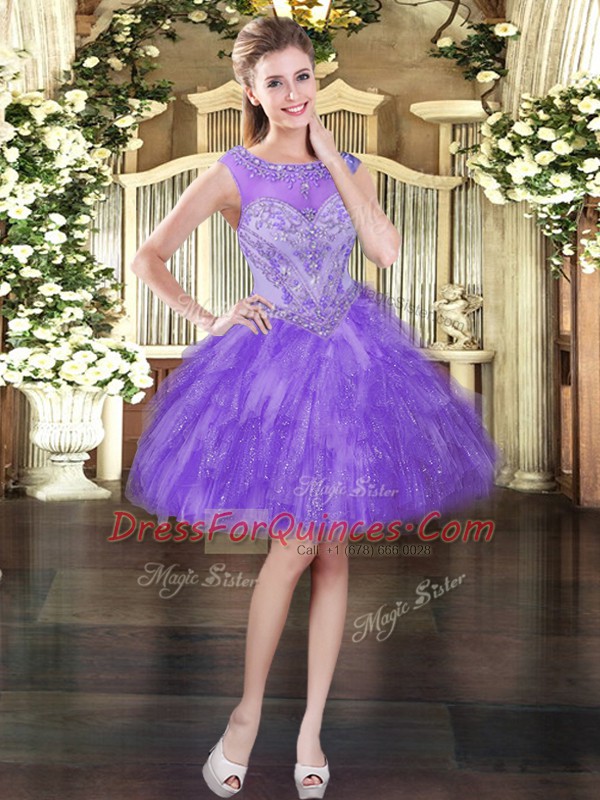 Glittering Mini Length Lavender Evening Dress Tulle Sleeveless Beading and Ruffles