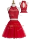 Glorious Tulle Halter Top Sleeveless Zipper Beading and Appliques Prom Dresses in Red