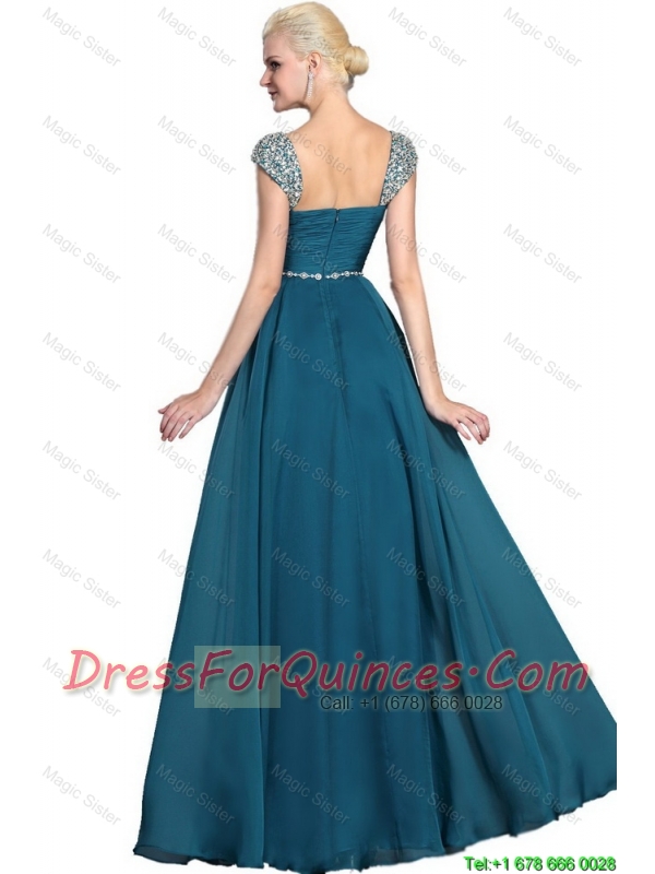 Gorgeous Beaded Teal Cap Sleeves Prom Dresses with Straps