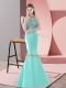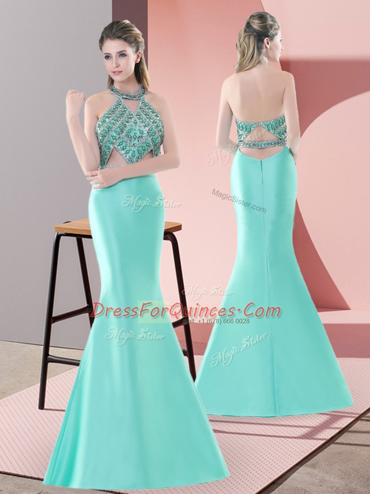 Halter Top Sleeveless Sweep Train Backless Prom Dress Blue and Apple Green Satin