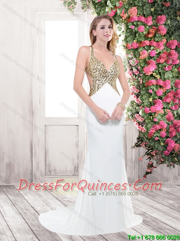 Inexpensive Brush Train Beaded Prom Dresses in White