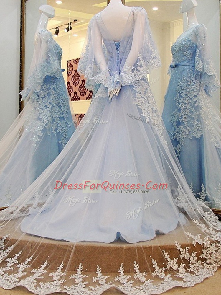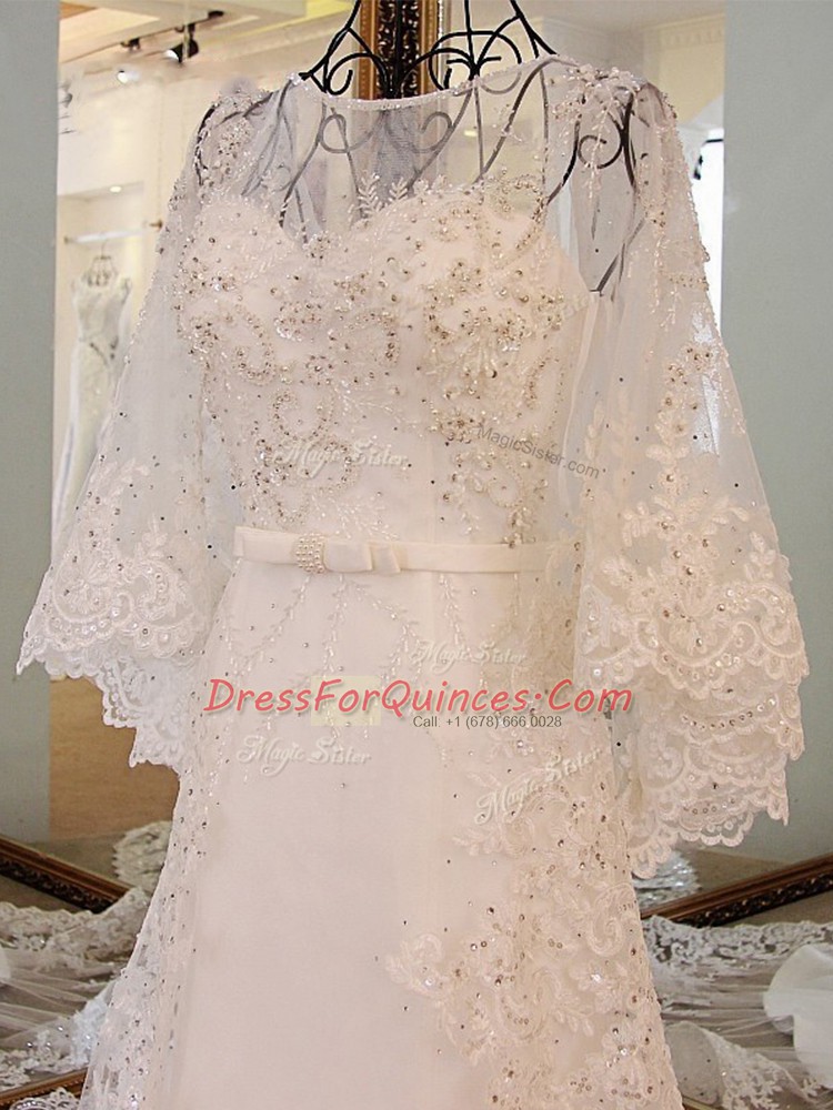 Low Price Long Sleeves Court Train Lace Up Lace and Appliques and Belt