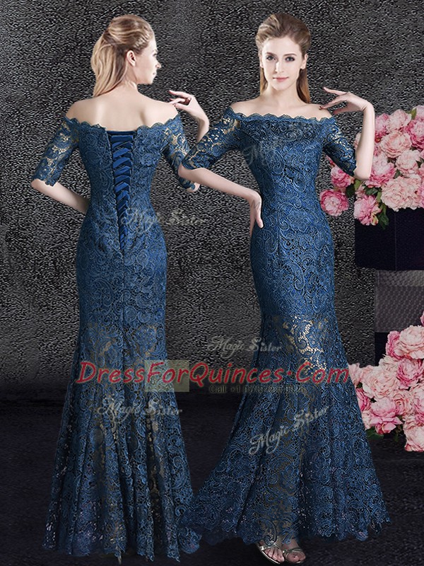 Mermaid Off The Shoulder Half Sleeves Lace Up Dress for Prom Navy Blue Lace