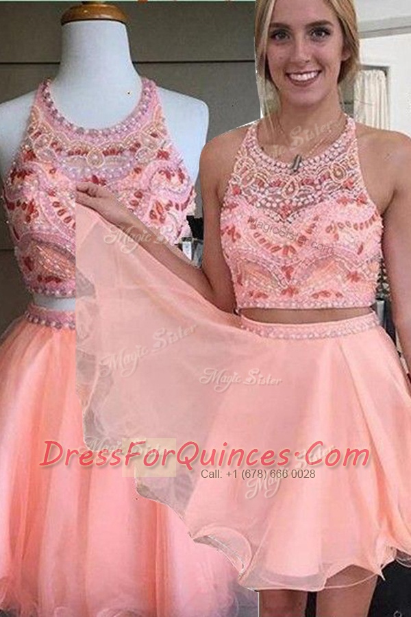 Most Popular Scoop Sleeveless Backless Mini Length Beading Dress for Prom