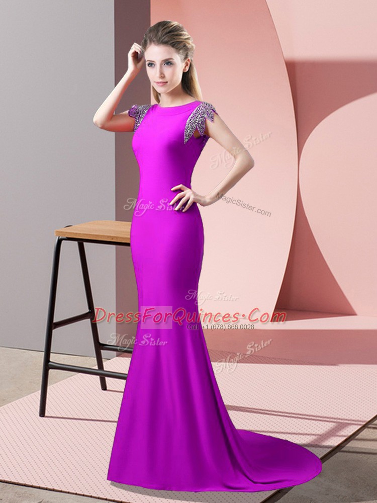New Arrival Fuchsia Prom Evening Gown Elastic Woven Satin Brush Train Short Sleeves Beading