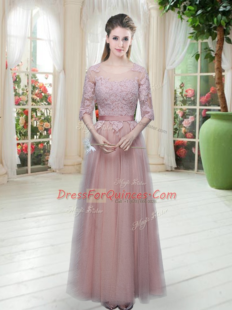New Arrival Pink Empire Scoop Half Sleeves Tulle Floor Length Lace Up Lace Prom Dresses