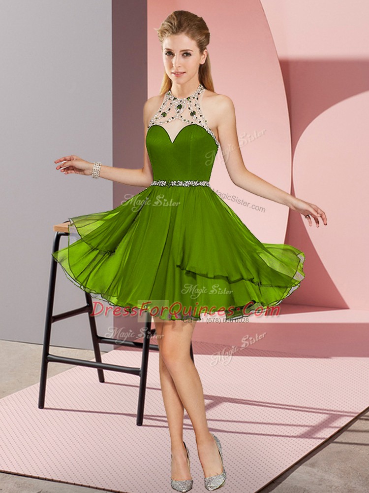 Olive Green Empire Chiffon Halter Top Sleeveless Beading Mini Length Zipper Prom Party Dress