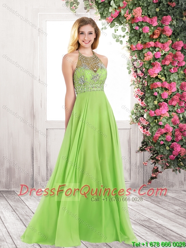 Popular Halter Top Beaded Prom Dresses with Brush Train