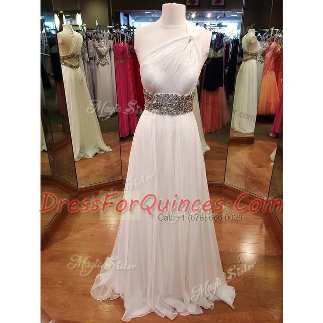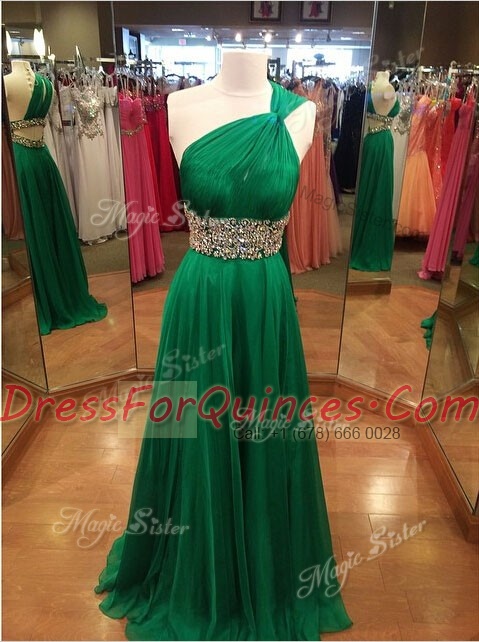 Pretty One Shoulder Green A-line Beading Evening Dress Backless Chiffon Sleeveless With Train