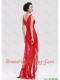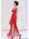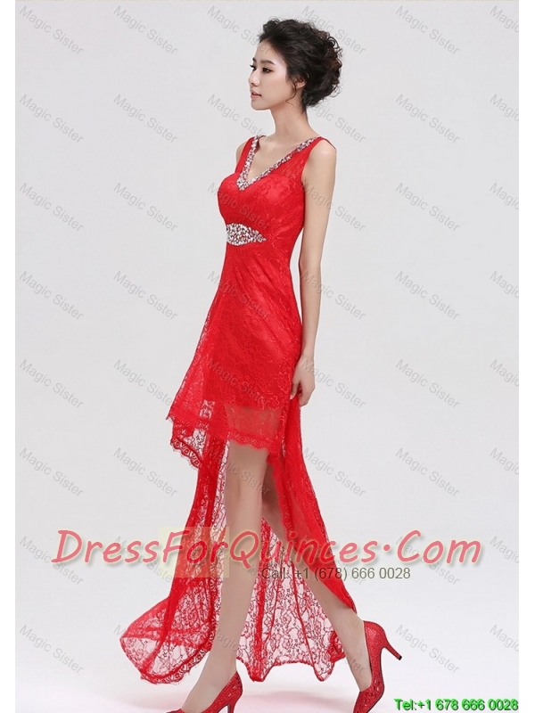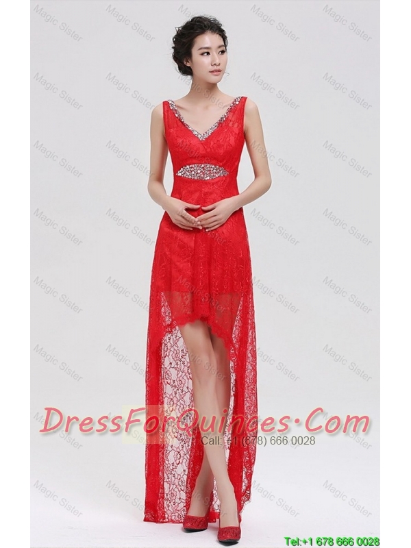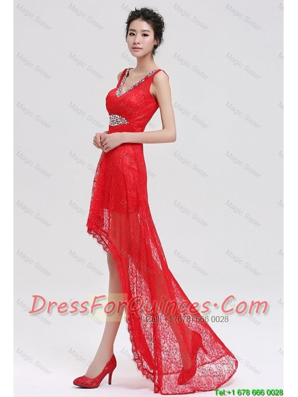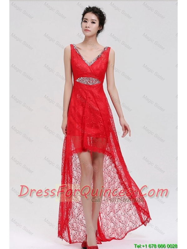 Pretty V Neck Laced and Beaded Red Prom Dresses with High Low