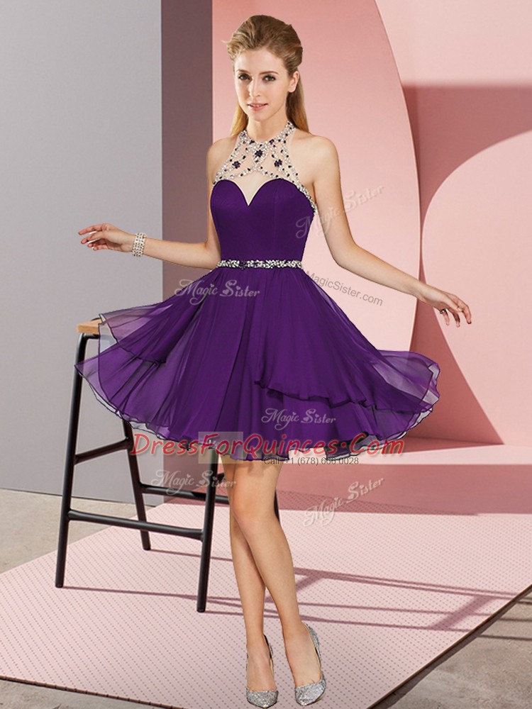 Purple Chiffon Zipper Halter Top Sleeveless Mini Length Prom Dress Beading