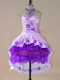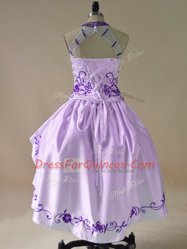 Satin and Organza Halter Top Long Sleeves Lace Up Embroidery and Ruffles Homecoming Dress in Purple