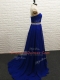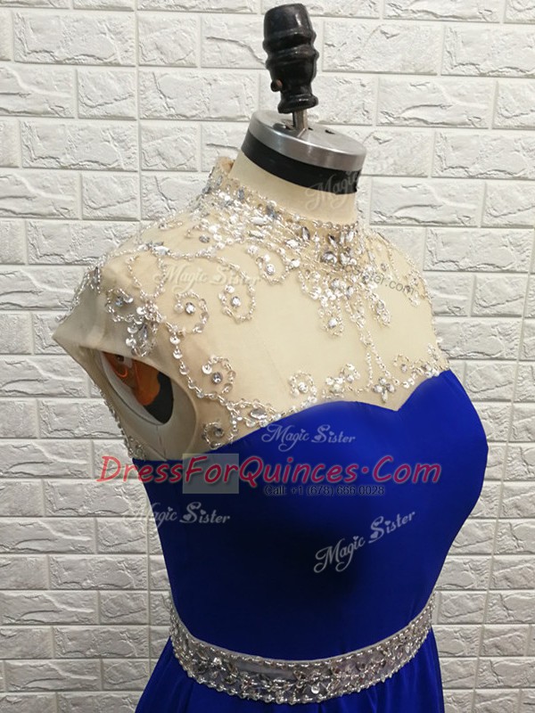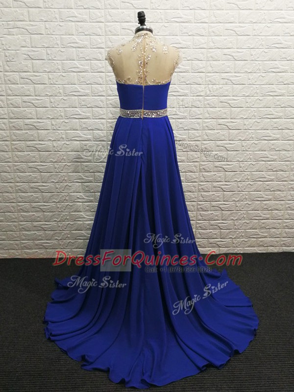 Simple Chiffon High-neck Sleeveless Brush Train Zipper Beading Prom Party Dress in Royal Blue