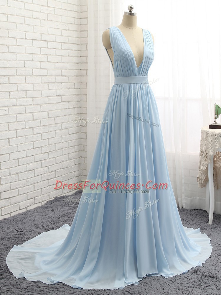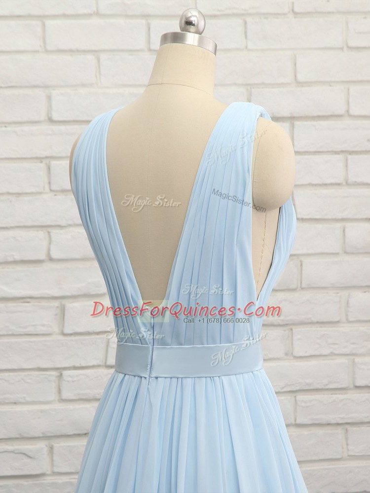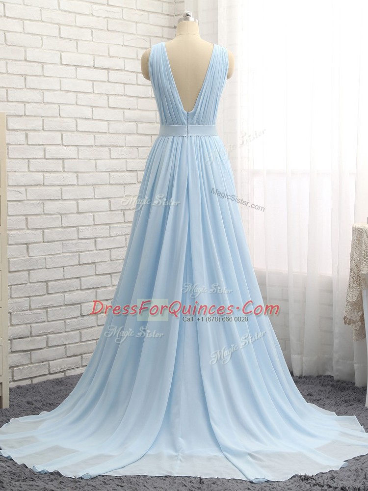 Sleeveless Chiffon Brush Train Backless Dress for Prom in Light Blue with Ruching and Belt