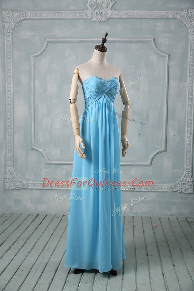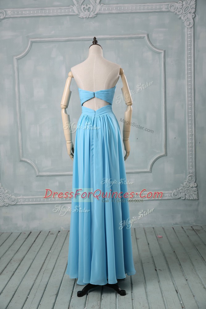 Sophisticated Baby Blue Chiffon Backless Sweetheart Sleeveless Floor Length Homecoming Dress Beading and Ruching