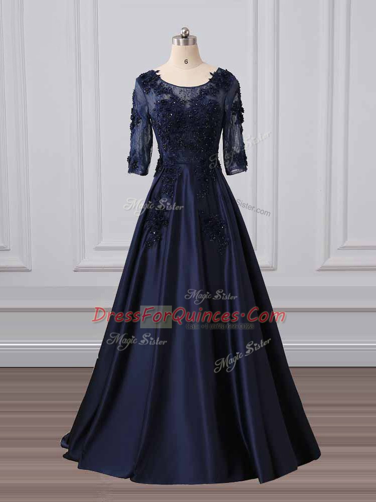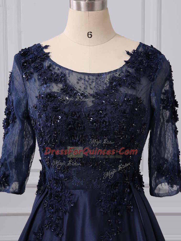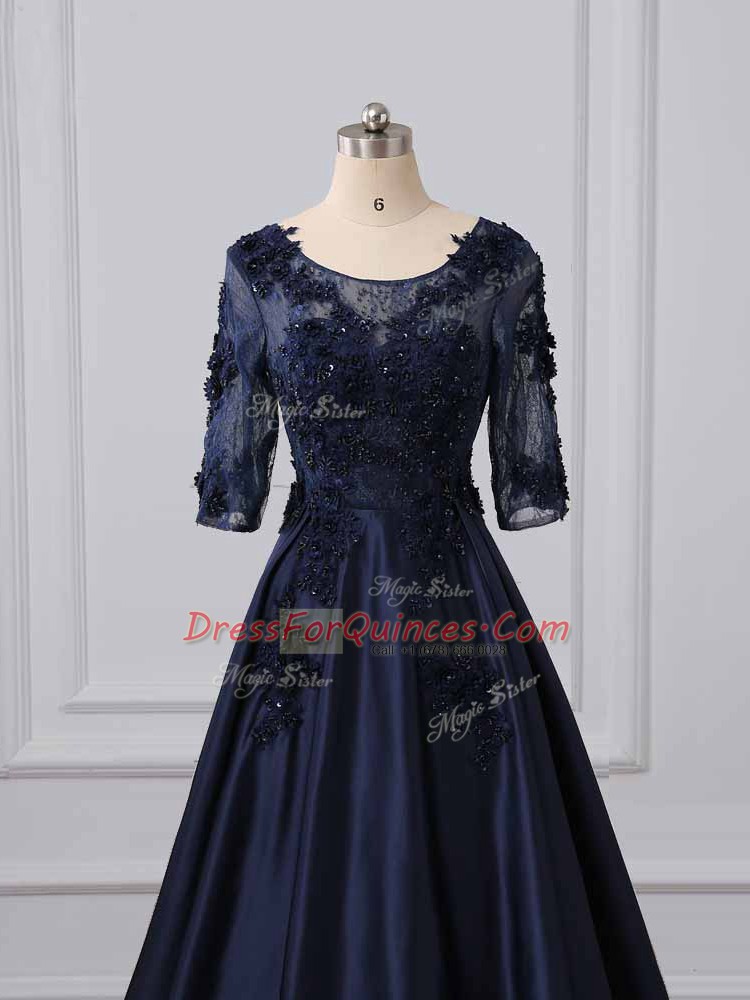 Stunning Scoop 3 4 Length Sleeve Satin Dress for Prom Lace and Appliques Brush Train Zipper