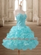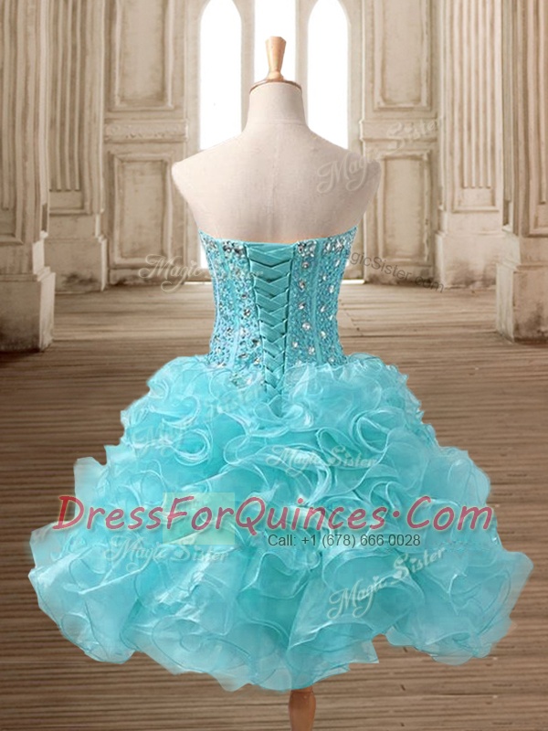 Sweetheart Sleeveless Prom Dress Mini Length Beading and Ruffles Aqua Blue Organza
