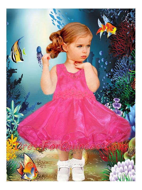 A-Line Scoop Tea-length Appliques and Ruffles Hot Pink Little Girl Dress for 2014