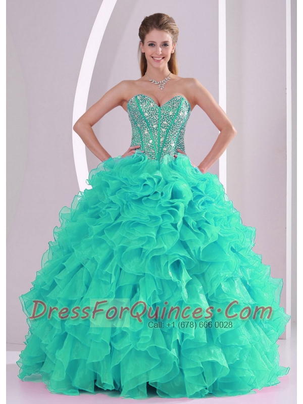 2013 Romantic Fall Sweetheart With Ruffles and Beaded Decorate In Turquoise For Quinceanera Gowns