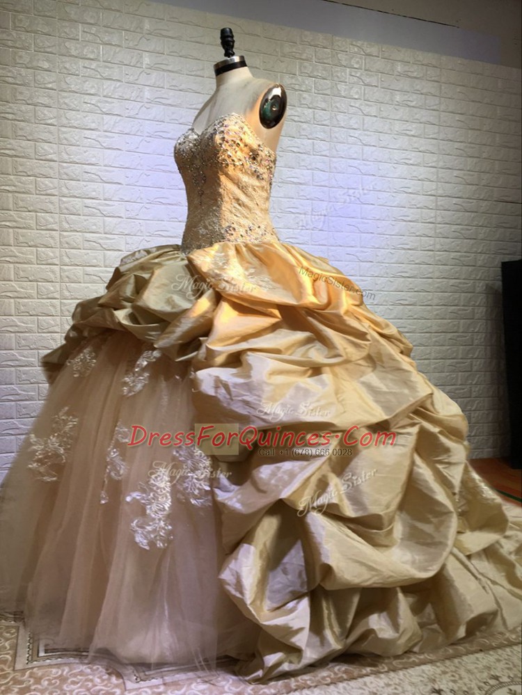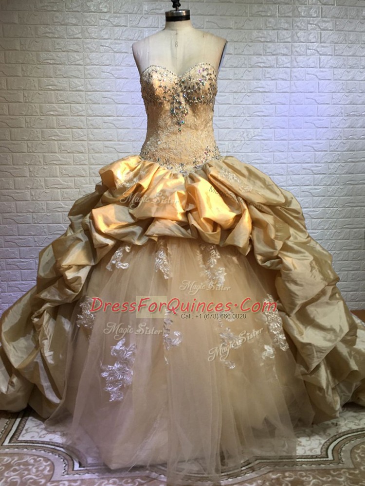 Artistic Sleeveless Beading and Appliques and Pick Ups Lace Up Ball Gown Prom Dress with Gold Court Train
