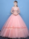 Baby Pink Tulle Lace Up Quince Ball Gowns Half Sleeves Floor Length Appliques