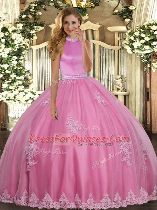 Dramatic Rose Pink Tulle Backless Halter Top Sleeveless Floor Length Quinceanera Gowns Beading and Appliques