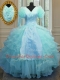 Dramatic V-neck Long Sleeves Ball Gown Prom Dress Floor Length Embroidery and Ruffled Layers Blue Organza