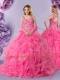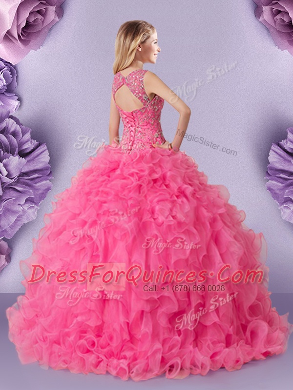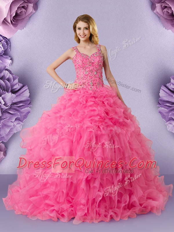 Elegant Straps Hot Pink Sleeveless Organza Lace Up 15 Quinceanera Dress for Military Ball and Sweet 16 and Quinceanera