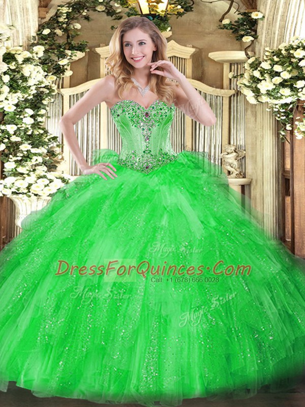 Enchanting Sleeveless Floor Length Beading and Ruffles Lace Up Quinceanera Dress with Green