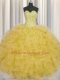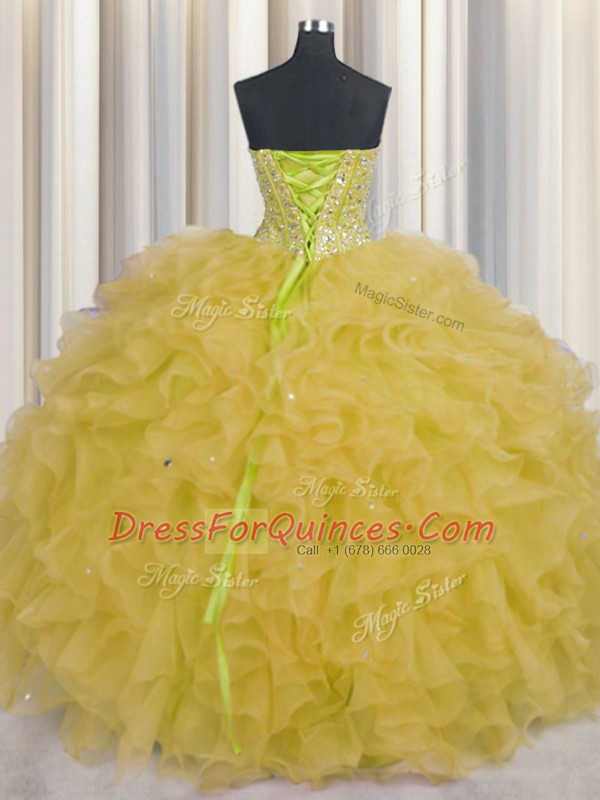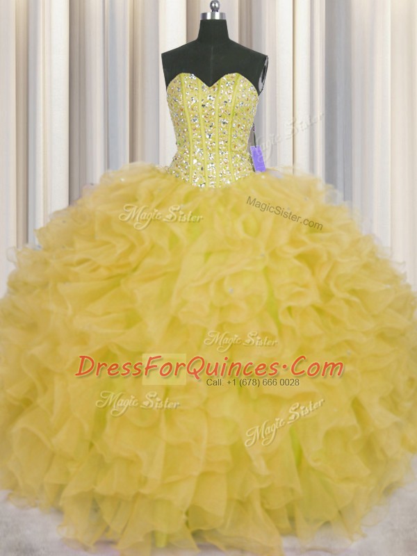 Enchanting Visible Boning Yellow Ball Gowns Sweetheart Sleeveless Organza Floor Length Lace Up Beading and Ruffles and Sashes ribbons Quinceanera Dress